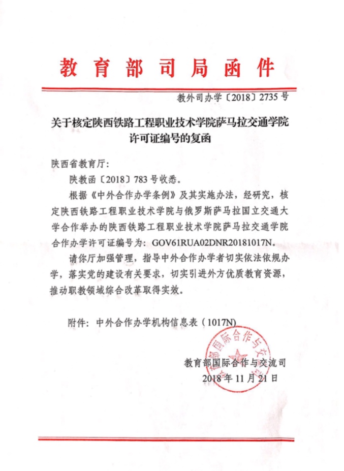 11月29日,陕西省教育厅印发《关于核定陕西铁路工程职业技术学院萨马拉交通学院合作办学许可证编号的批复》(陕教〔2018〕344号)文件,学院与俄罗斯萨马拉国立交通大学合作办学机构——陕铁院萨马拉交通学院正式获得教育部办学许可,从2019年起开始招生。