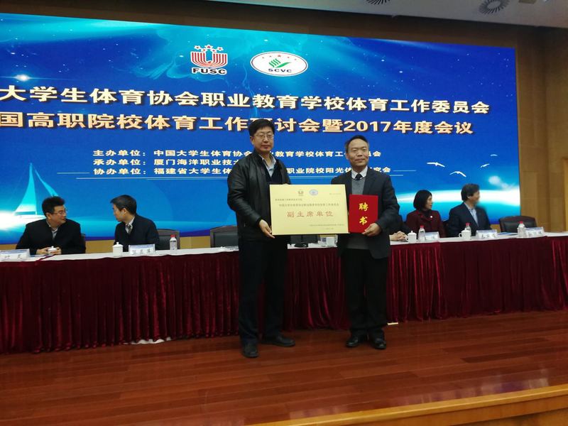 1月7日,在全国高职院校体育工作研讨会暨2017年年会上,学院当选为中国大学生体育协会职业教育学校体育工作委员会副主席单位;党委副书记车绪武被聘为副主席,体育教学部主任张骏被聘为副秘书长。