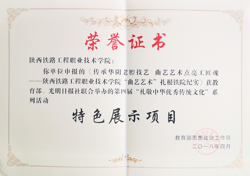 4月11日,教育部办公厅公布第四届“礼敬中华优秀传统文化”系列活动示范项目和特色展示项目。学院申报的《传承华阴老腔技艺曲艺艺术点亮工匠魂——陕西铁路工程职业技术学院“曲艺艺术”扎根铁院纪实》成功入选特色展示项目,全国高职唯一。