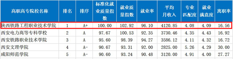 6月26日,西安交通大学中国西部高等教育评估中心首次公开发布《2018年陕西高校及专业毕业生就业质量指数评价报告》。学院在全省举办高职教育的58所院校中,是唯一一所就业质量评定等级为A+的院校,位居全省高职高专第一名。