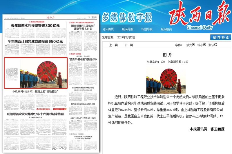 1月12日,《陕西日报》第3版(要闻版)以图片新闻的形式,报道盾构机落户学院的消息。现将全文转载如下: