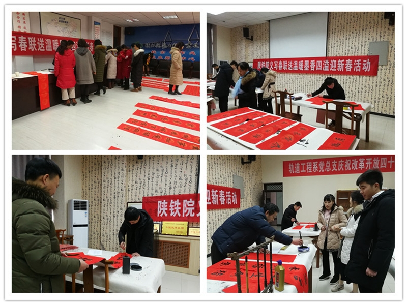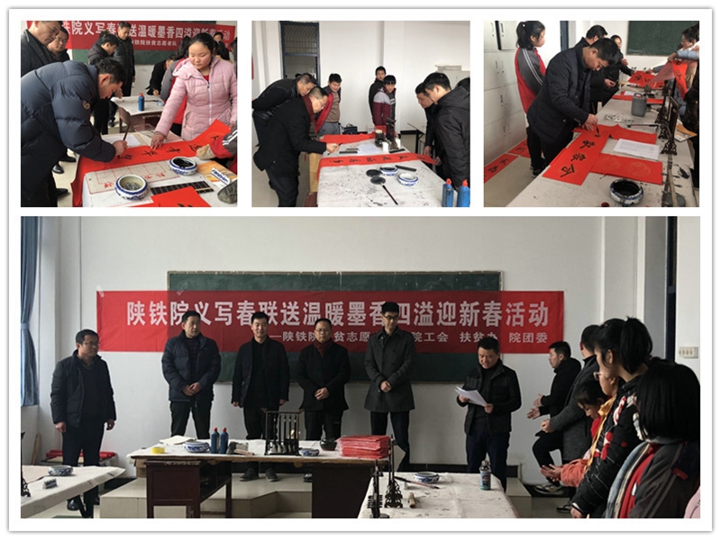 1月17日下午,在学院党委副书记、纪委书记、工会主席杨云峰的带领下,教师书法爱好者再次走进结对帮扶的临渭区阳郭镇阳郭村,为乡亲们义务书写春联,送上铁院人的美好祝福。活动现场人头攒动、暖意融融,翰墨飘香,一片热闹景象。村民争相围观,领取春联的村民更是接踵而来,整个阳郭村洋溢着浓郁的节日气息。活动当天,学院书法爱好者们为乡亲们书写了800多幅春联。一幅小小的春联,书写了吉祥的话语,送出了温暖,传递的是学院对阳郭人民美好的生活祝福,是推进精准扶贫,改善群众精神面貌,积极响应省上“写扶贫、话扶贫、唱扶贫”文化扶贫号召的有力举措。