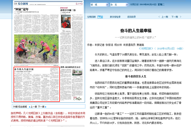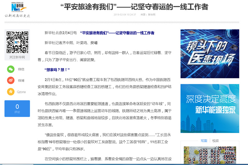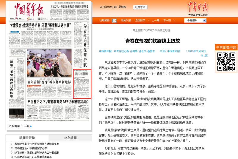 近日,一支90后青工班组火了,他们不畏严寒,自备干粮,依然坚守在工作岗位,为春运保驾护航的事迹,先后受到新华社、光明日报、中国青年报的深度报道。他们来自中国铁路西安局集团公司延安工务段富县桥隧检查工区的桥隧工,其中有9人毕业于陕铁院。现将原文转载如下: