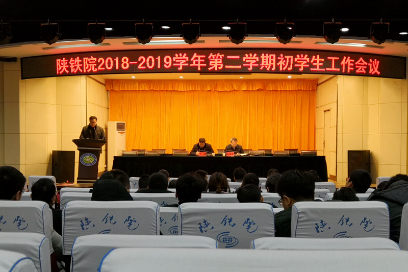 2月18日,陕铁院2018-2019学年第二学期开学学生工作会议在临渭校区学术报告厅顺利召开。学院党委书记王晖、党委副书记车绪武出席会议、学生处、团委、后勤处、招生办有关同志、各系党总支书记、学工办主任、全院辅导员、班主任参加。