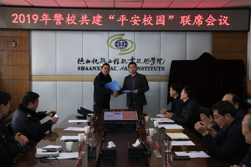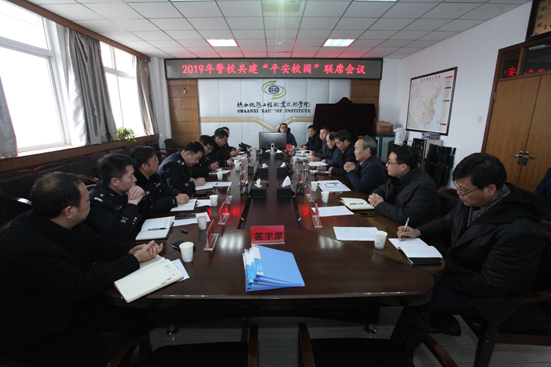 2月20日下午,学院在临渭校区会议室召开2019年警校共建“平安校园”联席会议。渭南市公安局经文保支队支队长张建忠、站南派出所所长王东辉、白杨派出所所长田震、高新分局国保大队大队长郭夏、临渭分局经文保大队副队长张新斌及多名警官应邀参加。学院党委书记王晖、党委副书记车绪武,学院党政办、学生处、后勤处、教务处、餐饮中心等部门负责人及安保处全体人员出席会议。会议由安保处处长李晓飞主持。