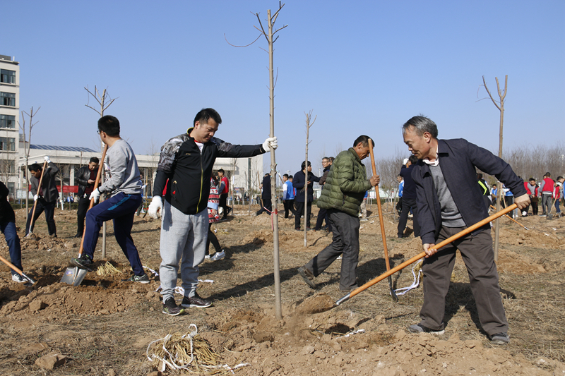 春回大地,草长莺飞,植树现场人潮涌动,大家领取了树苗和工具,并进行了合理分工,到达指定植树区域侯,手拿铁锨和水桶,扶树的扶树、填土的填土,浇水的浇水,一派热火朝天的劳动场面。大家或三五人一组,或八九人一组,默契配合,认真地完成着每一道工序,齐心协力种下150株美国红枫,200株绚丽海棠。