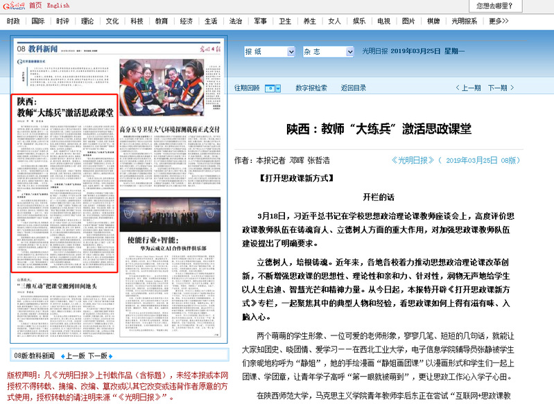 2019年3月25日,《光明日报》第8版以“陕西:教师‘大练兵’激活思政课堂”为题,《中国青年报》第6版,以“高职今年扩招100万,急需破解三大难题”为题,分别报道了学院结合行业教育资源,充分挖掘育人元素,形成了“两融入”思政课品牌项目的办学成果,以及积极响应国家“高职扩招100万”的消息。现将原文转载如下: