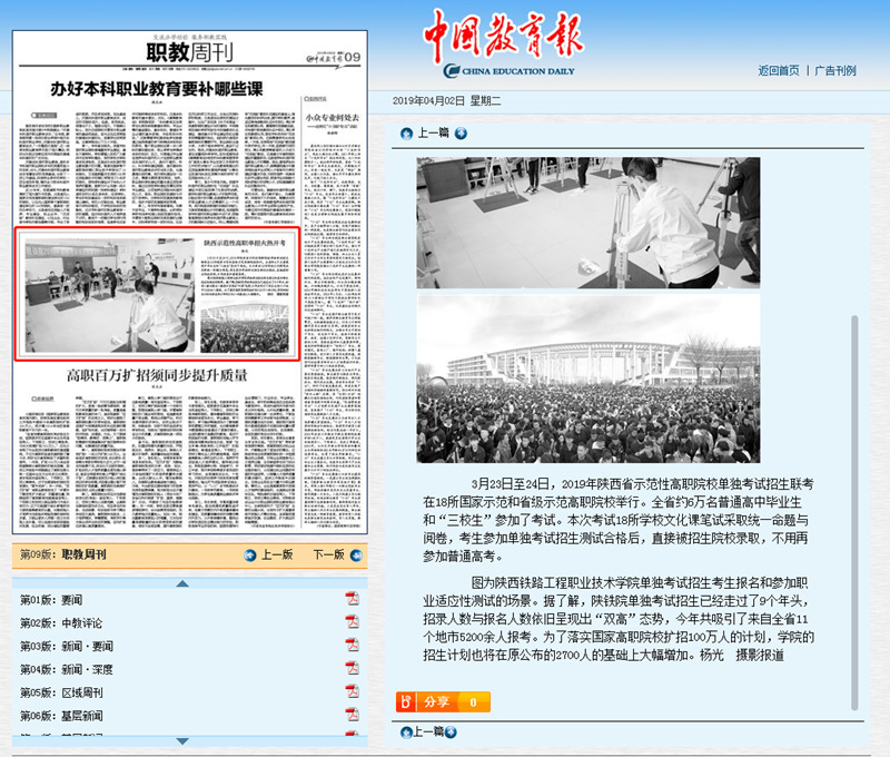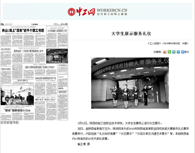 2019年4月2日,《工人日报》第2版以“大学生展示服务礼仪”为题,大篇幅报道了学院承办全省高职礼仪服务技能大赛的消息。《中国教育报》第9版以“陕西示范性高职单招火热开考”为题,对陕西省高职单招火爆形势进行了大幅图文报道,文中以陕西铁路工程职业技术学院单招为例,展现了陕西高职积极响应李克强总理在政府工作报告中提出的“高职扩招100万”政策,助力职业教育大发展的生动实践。现将原文转载如下,欢迎大家浏览:
