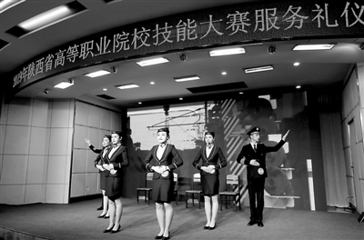 3月31日,陕西铁路工程职业技术学院,大学生在赛场上进行仪态展示。