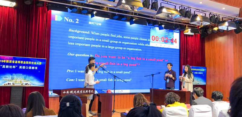 英语口语赛项由“职场陈述”、“职场交流”和“职场辩论”三个环节组成。“职场陈述”环节参赛者根据一张反映行业或企业业务发展或社会、经济等热点问题的统计图表来进行口头描述和观点阐述。“职场交流”则是参赛者根据所抽取的场景,与外籍主试官进行一对一的现场问答。无论是模拟的商务场景,还是紧扣社会发展和经济脉络的热点焦点,都是对选手心理素质、学业水平、社会常识、职场实践等全方面能力的考验。选手们在外籍专家引领下不断拓展思路,娓娓而谈,用灵活的交流技巧展现了自己在校所学所用,赢得了台下阵阵掌声。决赛环节是“职场辩论”,主要通过辩论的方式展现选手的英语实力。