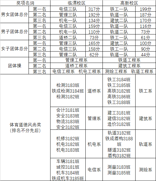 本次比赛中,临渭校区分赛场共有10支代表队260名运动员参与了32个项目的角逐;高新校区分赛场共有10支代表队250名运动员参与了10个项目的角逐,其中管理工程系的赵萌在女子100米赛事中,以13″92的成绩打破省第四十届大学生田径运动会14″08的记录;电气与信息工程系的张静在女子1500米赛事中以5′54″88的成绩打破省第四十届大学生田径运动会5′56″88的记录;电气与信息工程系的杨阳在男子跳远赛事中,以6.35米的成绩打破学院第十一届田径运动会6.26米的记录。