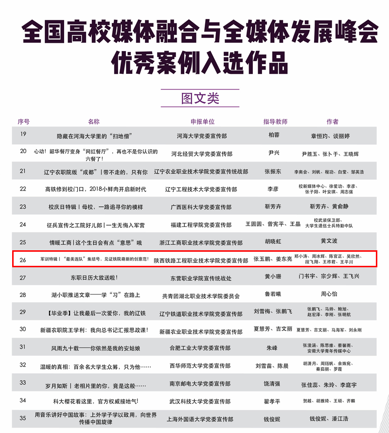 会上发布了全国高校全媒体优秀案例作品。中国教育报刊社副社长夏越出席活动并为获奖高校颁奖。学院新媒体中心参评的微信作品《军训特辑 |“最美连队”集结号,见证铁院萌新的创意范》,在本次评选中被评为图文类“全媒体优秀案例”,是陕西高职唯一获此奖项者。党委宣传部副部长张玉鹏代表学院上台领奖。