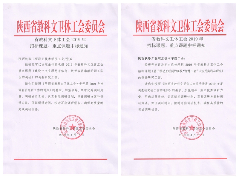 近日,陕西省教科文卫体工会公布了陕西省教科文卫体工会2019年调查研究招标、重点课题中标名单,学院杨云峰教授主持的招标课题《基于移动互联网的高校“智慧工会”云应用实践与研究》(项目编号:19ZB001),张威老师主持的重点课题《建设一支有理想守信念、敢担当讲奉献的职工队伍的调研》(项目编号:19ZD002)获批立项,此次立项重点课题共计12项。以上两课题的立项是学院在全省工会系统理论研究与实践应用相结合的调查研究中的重大突破。(赵晓玉)
