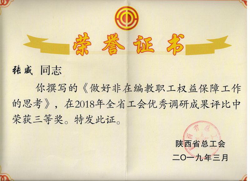 近日,陕西省总工会发布了陕工办发〔2019〕11号《关于2018年全省工会优秀调研成果评比情况的通报》,学院张威老师撰写的论文《做好非在编教职工权益保障工作的思考》获全省优秀调研成果三等奖。
