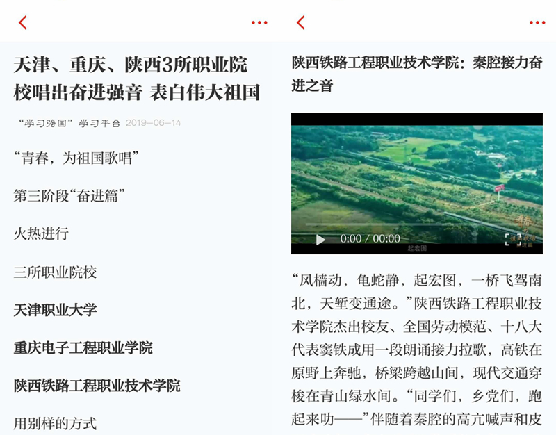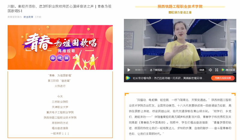 6月13日-14日,陕西铁路工程职业技术学院“青春助力中国高铁”奋进版MV先后被教育部微信公众平台“微言教育”、中宣部“学习强国”学习平台宣传报道。视频展现了一代代陕铁院学子秉承“吃苦奉献 拼搏争先”学院精神,奋战在铁路建设、运营的前线,不负青春使命,为祖国铁路事业的发展奉献自身力量。现将原文转载如下,欢迎大家浏览: