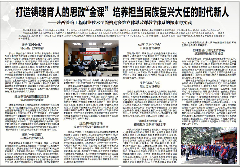 2019年6月19日《陕西日报》第10版,以“打造铸魂育人的思政“金课” 培养担当民族复兴大任的时代新人——陕西铁路工程职业技术学院构建多维立体思政课教学体系的探索与实践”为题,大篇幅宣传报道学院思政课创新改革成果。近年来,学院不断结合特色鲜明的铁路高职院校行业文化特点,融合行业企业和地方文化,创新教学形式,构建了基于学生参与体验的多维立体教学模式,有效提高了学生对思想政治理论课的获得感。现将报道原文转载如下,欢迎大家浏览: