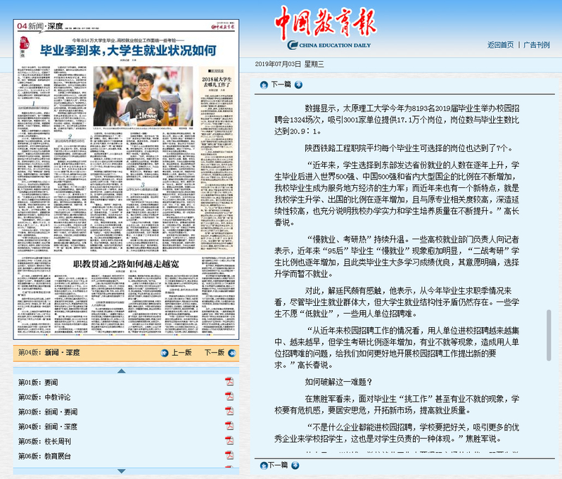 7月3日,《中国教育报》第4版以“毕业季到来,大学生就业状况如何”报道了学院紧跟行业发展步伐、兼顾学生就业和企业招聘需求、学院就业火爆的消息。《陕西日报》第11版以“以梦为马不负韶华”报道学院2019届毕业生签约铁路国企,以“吃苦奉献 拼搏争先”学院精神和“德修身 技立业”的校训为指引,投身祖国铁路事业的豪情壮志。现将原文转载如下,欢迎大家浏览!