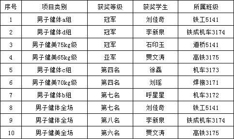 7月3日--7月7日,由中国大学生体育协会主办,中国大学生体育协会职业教育学校体育工作委员会执行,北京工业职业技术学院承办的全国高等职业院校的健身健美锦标赛在北京举行,本次比赛共有来自全国27支代表队、300多位大学生参赛。比赛设阳光组、精英组和超级组三个组别,学院由陈伟、王宏两位老师带领7名学生参加了阳光组全部7个项目的比赛,全体队员在比赛中不畏强敌,发挥出色,勇夺3项金牌、1项银牌、2项第四名,并获得团体总分一等奖和“体育道德风尚奖”。陈伟老师荣获“优秀教练员”称号,王宏老师荣获“优秀指导员”称号,高铁3175班贾文涛荣获“优秀运动员”称号。(任文)