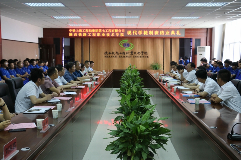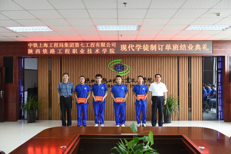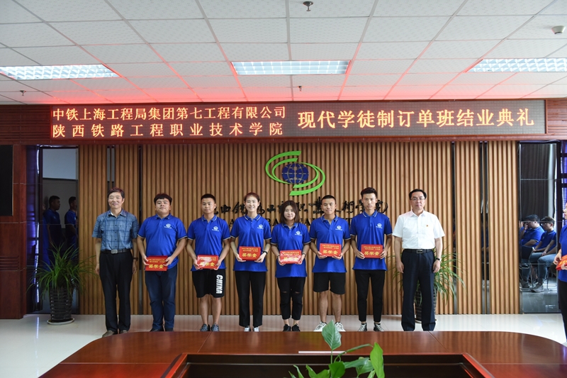 近年来,随着学院校企合作的深入发展,校企双方合作育人的办学特色日益显著。7月9日,中铁上海工程局集团第七工程有限公司(以下简称“上海局七公司”)现代学徒制班结业典礼在高新校区北三楼会议室举行。公司党委书记、董事长郑晖,党委副书记、纪委书记欧阳建国,工会副主席李慧智、物资设备部部长王立锋、技术中心主任潘相辉、人力资源部部长温妮妮、测量队队长巨新峰等企业相关负责人来校为管理系、测绘系现代学徒制班学生进行表彰奖励。学院副院长焦胜军,校企合作处、教务处、管理系、测绘系相关负责人出席,典礼由校企合作处处长王庆东主持。