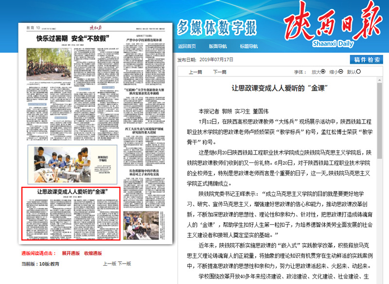 7月17日,《陕西日报》教育版以“让思政课变成人人爱听的金课”为题报道了学院思政课教育教学改革的实践。现将原文转载如下,欢迎大家浏览!