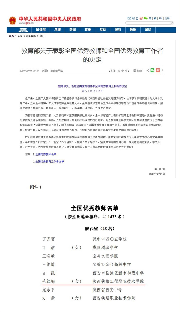9月9日,教育部公布《关于表彰全国优秀教师和全国优秀教育工作者的决定》,决定表彰全国优秀教师1432名和全国优秀教育工作者158名,学院毛红梅老师获评为“全国优秀教师”荣誉称号。