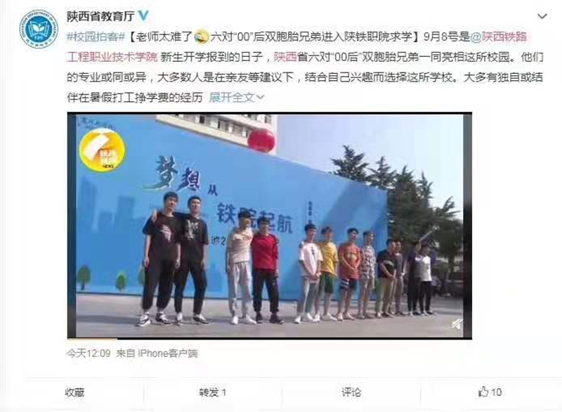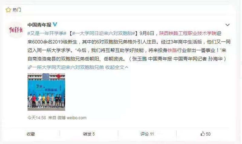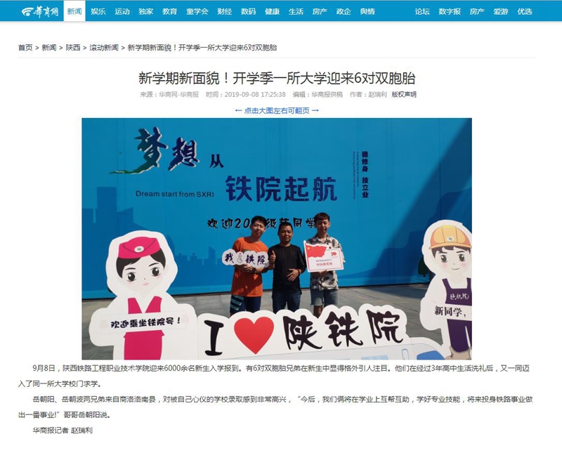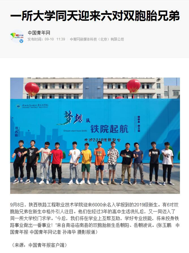 9月8日,学院喜迎2019级新生6000余名新生,迎新工作受到多家媒体报道。尤其迎新当天,6对双胞胎齐上陕铁院吸引了陕西电视台、渭南电视台等多家媒体采访,《中国青年报》以“一大学同日迎来六对双胞胎”为题,陕西电视台以“六对00后双胞胎兄弟进入同一职院求学”为题,华商网以“新学期新面貌!开学季一所大学迎来6对双胞胎”为题,渭南电视台以“陕铁院迎来6000余名新生 其中6对双胞胎”为题纷纷进行了报道,陕西省教育厅官方微博、华山网等多家媒体也相继进行了转发。现将部分报道全文转载如下: