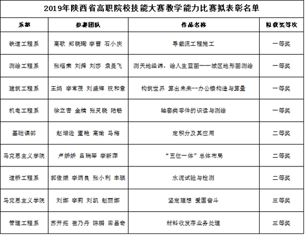 近日,陕西省教育厅对2019年陕西省高职技能大赛教学能力比赛拟表彰名单进行了公示,学院教师再创佳绩。报送的9部作品全部获奖,其中一等奖4项、二等奖3项、三等奖2项,获奖数量陕西高职并列第一,获奖等次陕西高职第一。