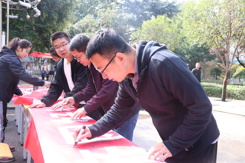 10月16日中午,学院在临渭校区举办“弘扬扶贫济困好传统 携手打赢脱贫攻坚战”师生签名活动,学院各学生社团、青年学生志愿者代表约300余名师生参与活动并在横幅上郑重签名。