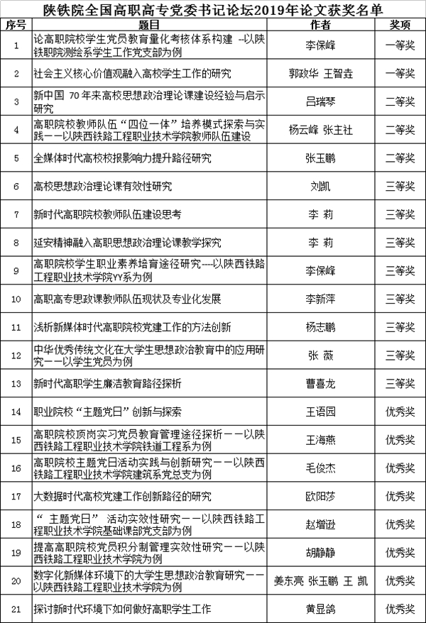 2019年论文征集活动,共收到论文723篇。本次大会还就征集论文进行了表彰,学院党委高度重视,积极组织论文征集工作,收获颇丰,学院李保峰老师的《论高职院校学生党员教育量化考核体系构建》等多篇论文获奖。
