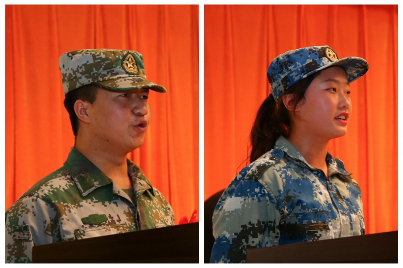 监理3181班许康贝代表退役队员发言,他深情回顾了在护校队这个大熔炉里摸爬滚打,快速成长的点点滴滴,在护校队这个大家庭中与队友们一起并肩作战,相互鼓励,圆满完成安保任务时的喜悦时刻;由衷表达了“身退心不退,永做一家人”的朴素情怀;激情立下了“脱下迷彩,队魂还在,若有战,召必回”的铮铮誓言。高乘3191班贺思琪代表新队员发言,她以“绿色的信仰”为题,讲述了自己穿上迷彩,成为一名护校队员的骄傲和自豪,表达了要以优秀退役队员为榜样,不忘建队宗旨,牢记安保使命,继续努力,接续奋斗,在守护“校园安宁,师生平安”中高扬绿色信仰之帆。