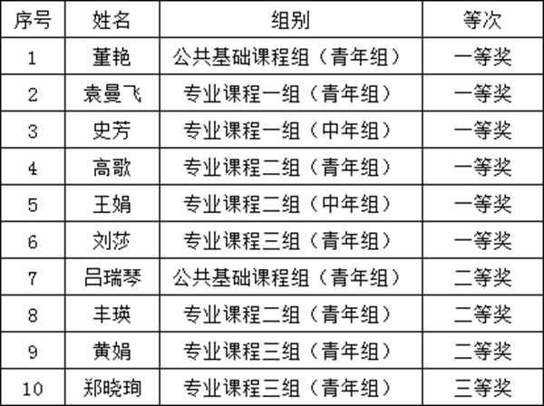 11月10日,2019年陕西省高职课堂教学创新大赛决赛落下帷幕,学院推荐参赛的10名教师全部获奖,其中,董艳等6名教师获得一等奖,吕瑞琴等3名教师获得二等奖,郑晓珣获得三等奖,学院获得优秀组织奖。学院获奖数量和等次均位居陕西省高职第一。这些成绩的取得是学院认真贯彻落实《国家职业教育改革实施方案》,深化“三教”改革的集中体现;是学院高度重视教学,以教学为中心的充分体现;是广大教师深化课堂教学改革、强化课堂教学创新取得的硕果。