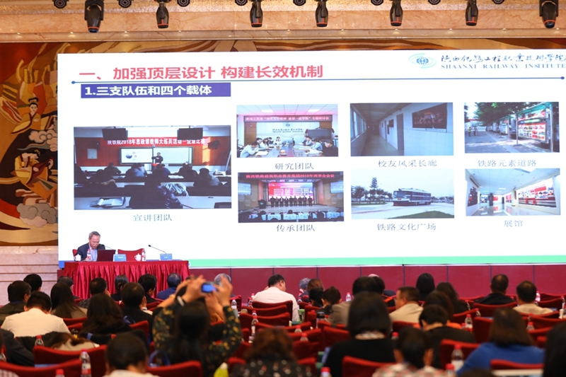 会上,车绪武应邀在会上作了题为《铸路魂 锻匠心 育铁人——陕铁职院社会主义核心价值观融入校园文化实践探索》的专题分享。他首先介绍了学院情况及近期获得荣誉,随后从六个方面分享了学院在社会主义核心价值融入校园文化实践中的探索与形成:一是加强顶层设计,构建长效机制,通过三支队伍、四个载体、五大平台来培养担当民族复兴大任的时代新人;二是开展课程思政,形成育人合力,充分挖掘各门课程的思想政治教育功能,把社会主义核心价值观融入各门课程,推进全员全过程全方位育人;三是弘扬中华优秀传统文化和开展工业文化进校园,实施文化育人,增强大学生文化自信;四是弘扬铁军精神,大力弘扬“能吃苦、能战斗、能奉献”的铁军精神,传承“严字当头,铁的纪律”的优良传统,坚持半军事化管理,锻造铁路工匠;五是坚持志愿服务,每年开展形式多样、主题突出的志愿服务活动以及暑期三下乡活动,培育学生奉献精神;六是做强网络文化,构筑了“三微两网一平台”的网络宣传新格局,全方位、立体式弘扬主旋律、传递正能量,营造了良好的育人氛围。
