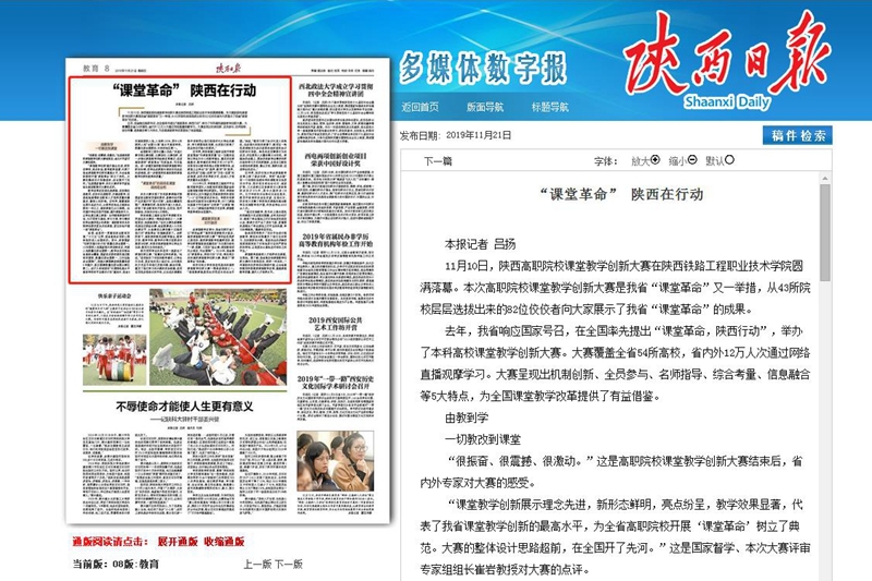 11月21日,《陕西日报》第8版教育版以“‘课堂革命’陕西在行动”为题,大篇幅报道了学院承办的陕西高职院校课堂教学创新大赛。其中采访了学院在大赛中获得一等的教师及学生在参与“课堂革命”过程中的感悟与收获,同时,以学院为典型案例诠释了学院“课堂革命”的战场在课堂、战线在全校所取得的成效。