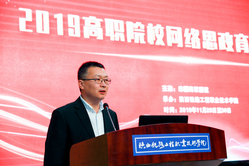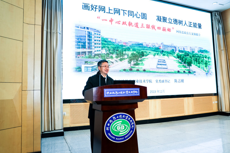 湖南高速铁路职业技术学院党委副书记陈志刚作了《画好网上网下同心圆,凝聚立德树人正能量》分享,介绍了湖南高速铁路职业技术学院“一中心双轨道三联线四驱动”育人分享和网络思政成绩。