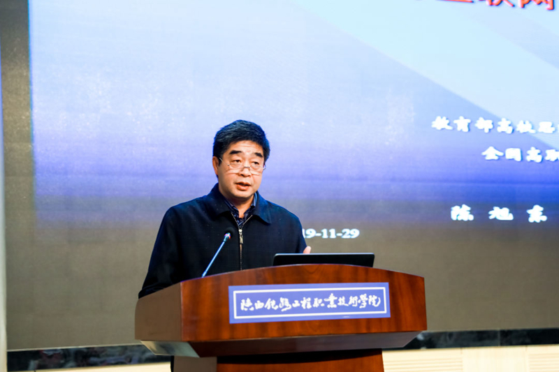 教育部高校思政课教指委高职高专分委会副主任委员、全国高职高专院校思政课建设联盟理事会会长、中共芜湖市委党校常务副校长陈旭东教授作《把握特点,坚定信心,做好网络思政工作》主题报告。他讲述了当代网络思政工作的时代背景及重要性,结合高职高专思政课的特点讲解了做好网络思政工作的具体做法,为网络思政工作指明了方向。
