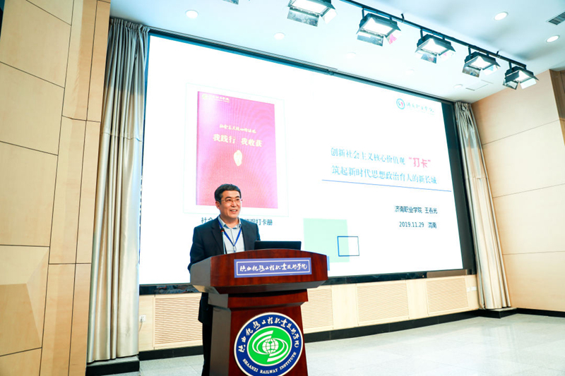 在“双高计划”下高职院校网络思政创新研讨会环节,济南职业学院党委书记王春光作了《创新社会主义核心价值观“打卡”,筑起新时代思想政治育人新长城》分享,介绍了济南职业学院在探索社会主义核心价值观的培育践行方面的具体经验做法。