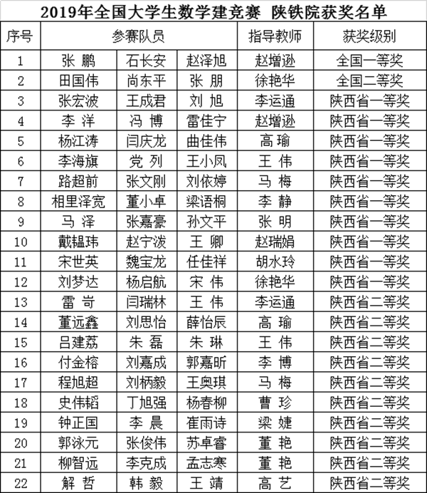 近日,陕西省教育厅办公室公布了2019年全国大学生数学建模竞赛陕西赛区获奖名单,学院共有22队在2019年全国大学生数学建模竞赛中获奖,其中获全国一等奖1项、全国二等奖1项、陕西一等奖10项、陕西二等奖10项;学院获“陕西赛区优秀组织工作奖”称号,赵增逊老师获得“陕西赛区优秀组织工作者”称号。