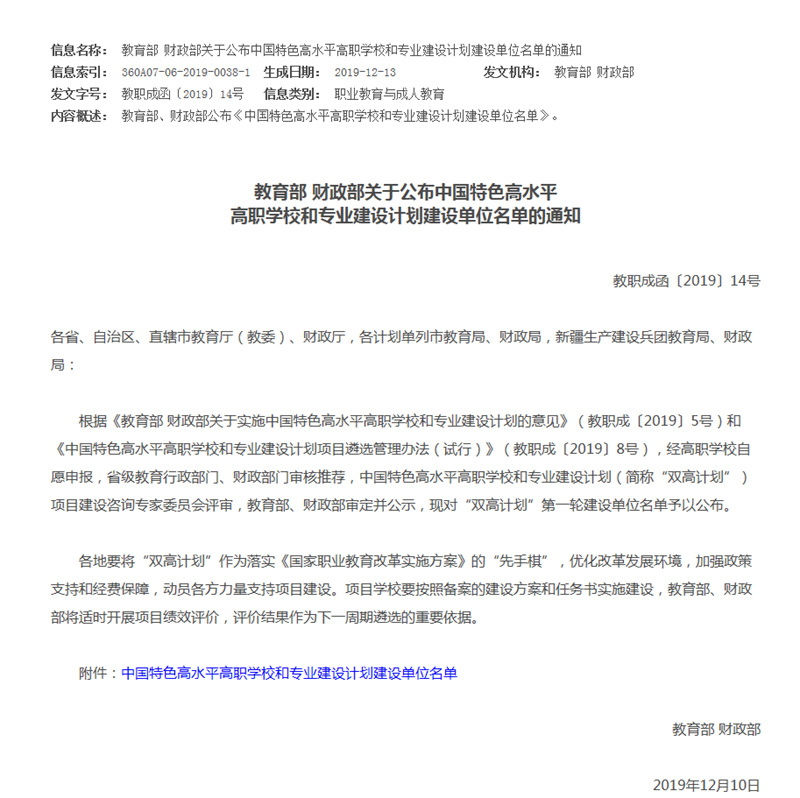 12月10日,教育部、财政部公布了中国特色高水平高职学校和专业建设计划建设单位名单。经过申报、审核、评审和公示等环节,学院成功入选中国特色高水平高职学校建设单位,全国56所高职院校入选。