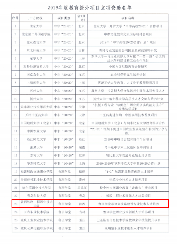 近日,教育部下发了《关于2019年度教育援外项目立项的通知》(教外司办学〔2019〕3300号),学院申报的“鲁班学堂菲律宾铁路建设专业人才培养” 项目获得教育部批准立项,陕西省有两所院校申报的项目获批。