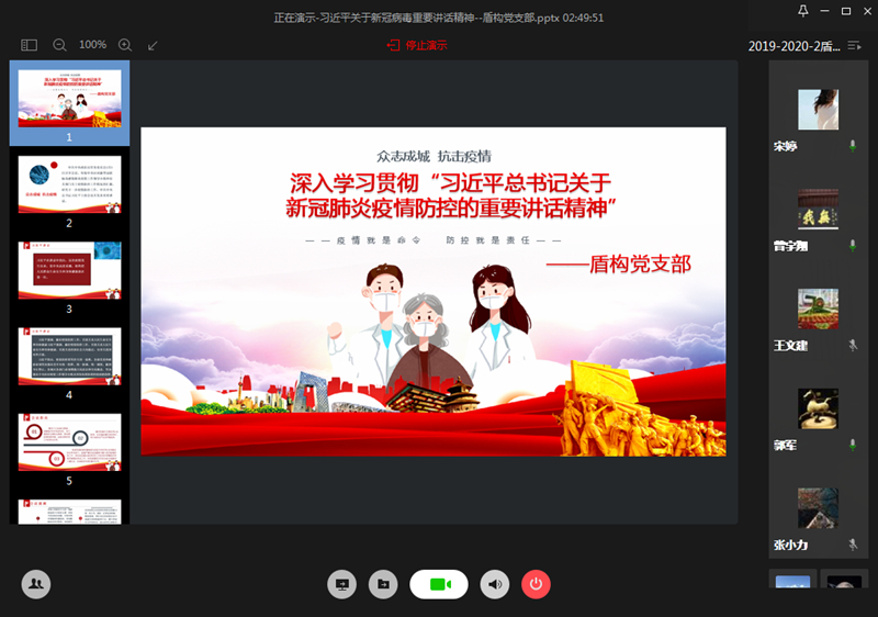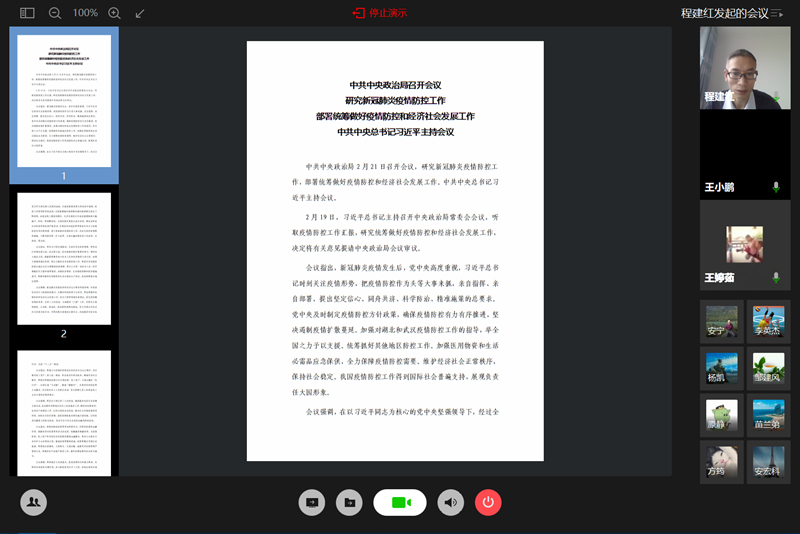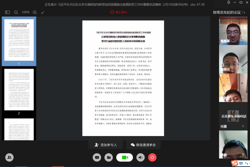 各支部在视频会议上,首先集体学习了习近平总书记在中央政治局常委会议研究应对新冠状病毒肺炎疫情工作时的讲话、统筹推进新冠疫情防控和经济社会发展工作部署会议上的讲话等系列讲话,并进行了积极讨论。