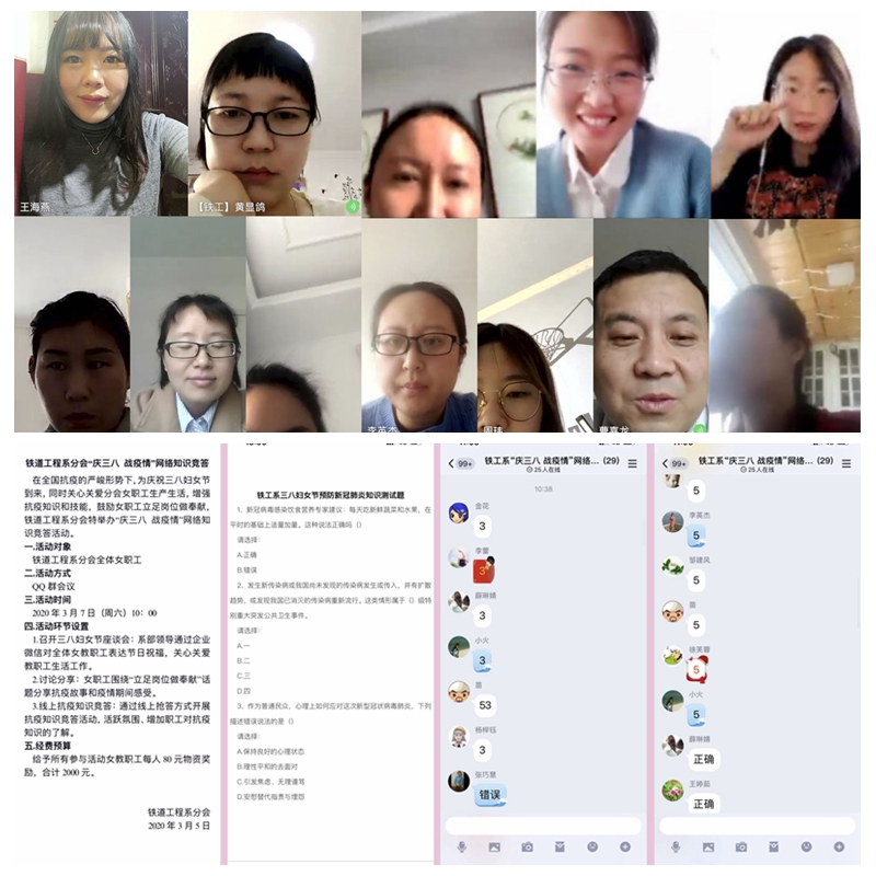 铁道分会举办了“庆三八 战疫情”网络知识竞答活动。活动中,系书记曹喜龙、系主任刘明学分别向女职工们送上节日祝福,肯定了一直以来女教师们在系部发展中所做的贡献,鼓励大家持续发扬奉献服务精神,为打赢疫情防控阻击战贡献巾帼力量。同时,嘱咐大家注意继续做好防范,在“抗疫”中坚持做好教书育人工作,争取取得更大成绩。在网络知识竞答环节中,各位老师积极竞答,氛围热烈,寓教于乐,活动取得了良好的效果。(杨志鹏)