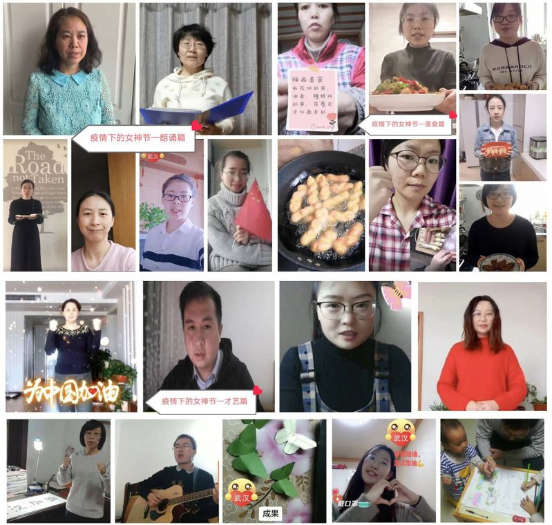 基础分会举行“立足自身岗位抗疫情,基础分会教师在行动”为主题的节日活动,该活动分为朗诵、摄影、书画、厨艺比赛,基础分会教职工在做好线上教学的同时发挥自己的特长,或展示精湛的厨艺、或展示精美绘画、或展示感人的朗诵,尤其英语教研室4位女教师发挥自己的优势用英语为宣传片《武汉疫情》配音,老师们用自己的行动抗击疫情,武汉必胜、中国必胜!(赵增逊)