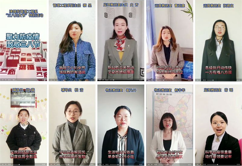 管理分会为庆祝三八妇女节特别活动,录制了“聚力防疫情,致敬三八节”视频!系部精心设计,苏开拓老师填词,26名女教师全部视频出镜朗诵,诗歌聚焦铁院人抗击疫情的系列举措,展现了铁院人对抗战一线的广大医务工作者和干部群众的敬意,讴歌大爱,鼓舞士气,传递了抗疫正能量,也彰显了铁院人在疫情面前的担当精神(李大川)
