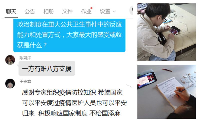 观看完课程直播后,同学们讨论着自己的收获和感悟。有的为中国共产党的正确领导和祖国的强大而骄傲自豪,有的为全国人民的团结一致而无比感动,有的向疫情一线的工作人员表示感谢,有的认识到人与自然和谐相处的重要。希望他们在以后能像课堂中提到的此次抗疫主力军之一——“90后”一样,担当着属于“00后”的时代责任和历史使命,在祖国的广袤大地上实现他们的人生理想!(张肖)