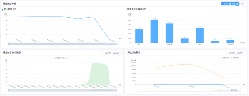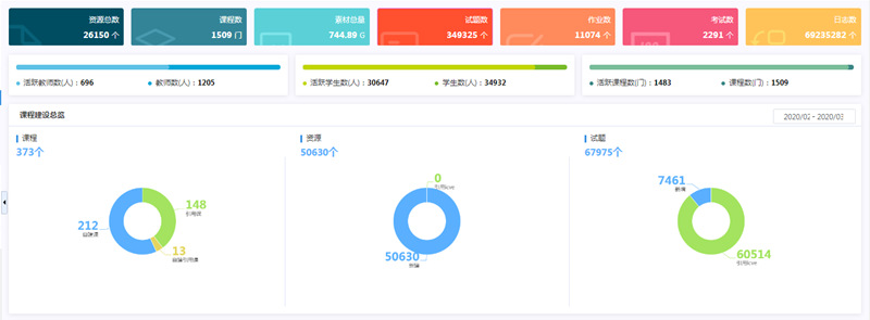 全校共开设在线理论教学课程243门课程,开课率100%,授课教师周授课447人(5622人次),学生周线上学习284024人次,学生上课率99.56%。