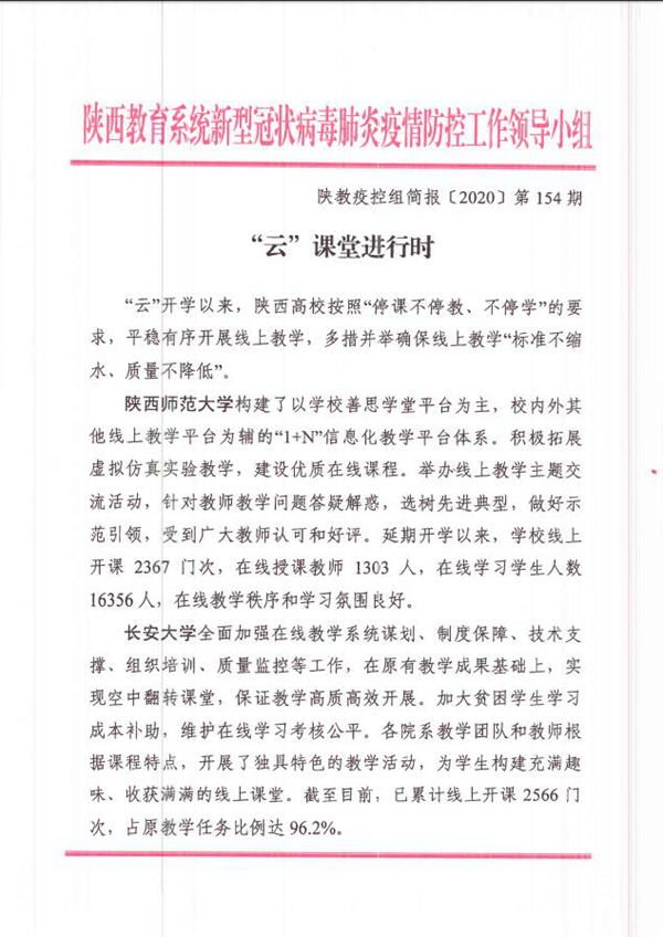 4月7日,陕西教育系统新型冠状病毒肺炎疫情防控工作领导小组简报第154期以《“云”课堂进行时》为题报道了陕西高校按照“停课不停教、不停学”的要求,开展线上教学的措施,其中将学院线上教学的举措作为典型案例进行了报道。现将原文转载如下,欢迎各位老师浏览: