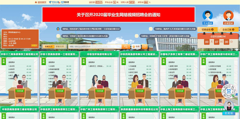 通过宣传动员和联系,本次网络视频双选会有中铁四局、中铁十二局、中铁十四局、中铁广州工程局、中铁上海工程局等29家用人单位注册参加,提供岗位数100余个,招聘人数2141人。招聘会全程线上组织,毕业生在线投递简历,用人单位在线上发布招聘信息、查看毕业生简历,通过网络视频对应聘毕业生进行面试。