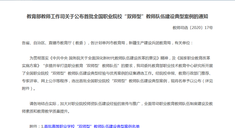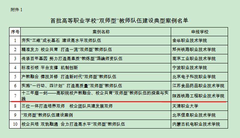 近日,教育部教师工作司公布了首批全国职业院校“双师型”教师队伍建设典型案例名单,学校《十二年磨一剑——高职院校产教融合、校企共育“双师型”教师队伍的探索与实践》案例成功入选。