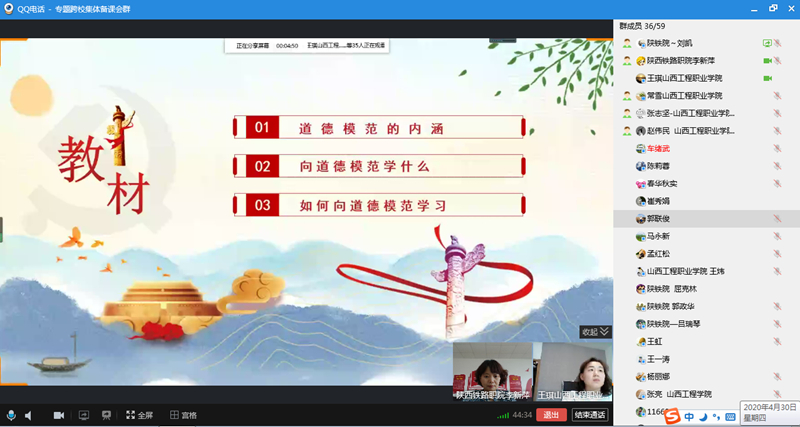 第一部分是战“疫”线上金课说课,山西工程职业学院概论课教师王妙健就“概论”课第十章五位一体总体布局,第四节坚持在发展中保障和改善民生展开说课;陕铁院“基础”课教师刘娜就第五章明大德守公德严私德第四节向上向善、知行合一第一目向道德模范学习,感动更要行动进行说课。为思政课教师提供了参考,拓展了思路。