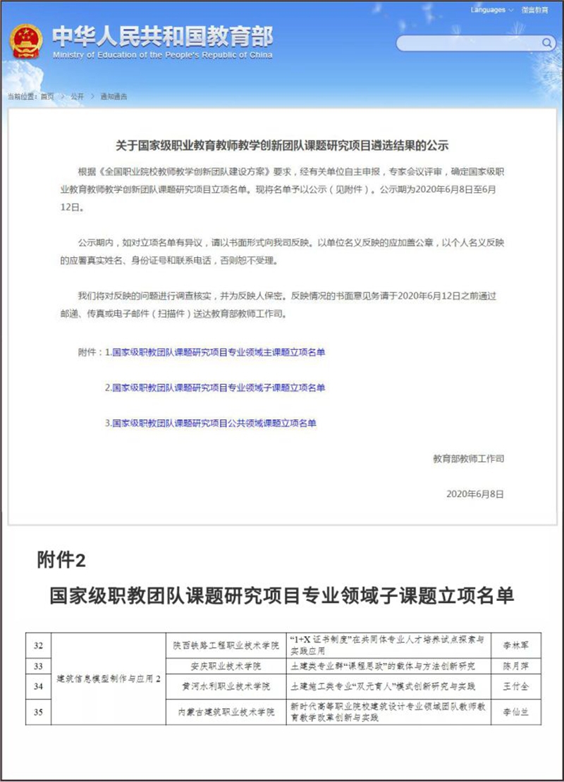 6月8日,教育部教师工作司发布了《关于国家级职业教育教师教学创新团队课题研究项目遴选结果的公示》,由学校副校长李林军教授负责的“建筑信息模型制作与应用专业国家级职业教育教师教学创新团队”所研究的课题《“1+X 证书制度”在共同体专业人才培养试点探索与实践应用》入选“国家级职教团队课题研究项目专业领域子课题立项名单”,全国共入选65项。